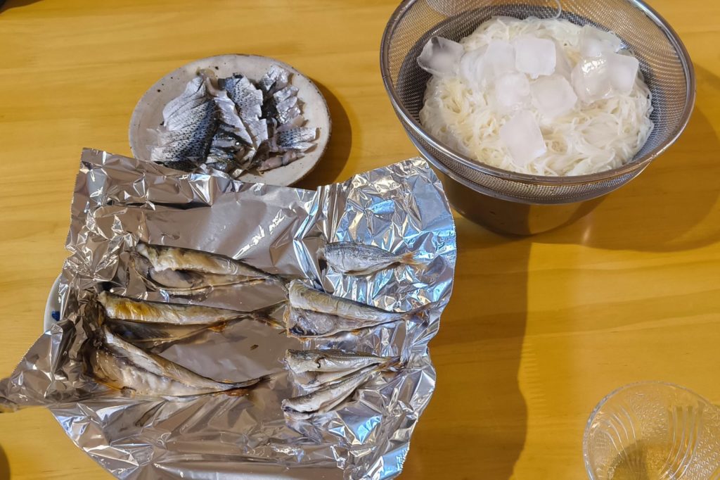 翌日、小アジと小サバは塩焼き。コノシロは酢締めに。(+そうめん)