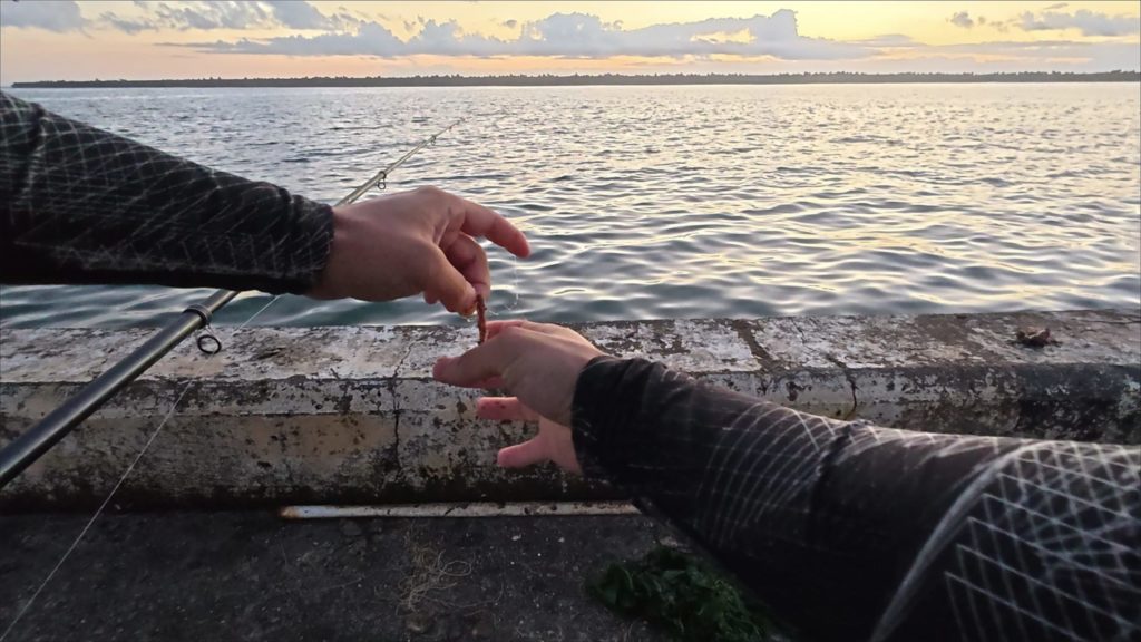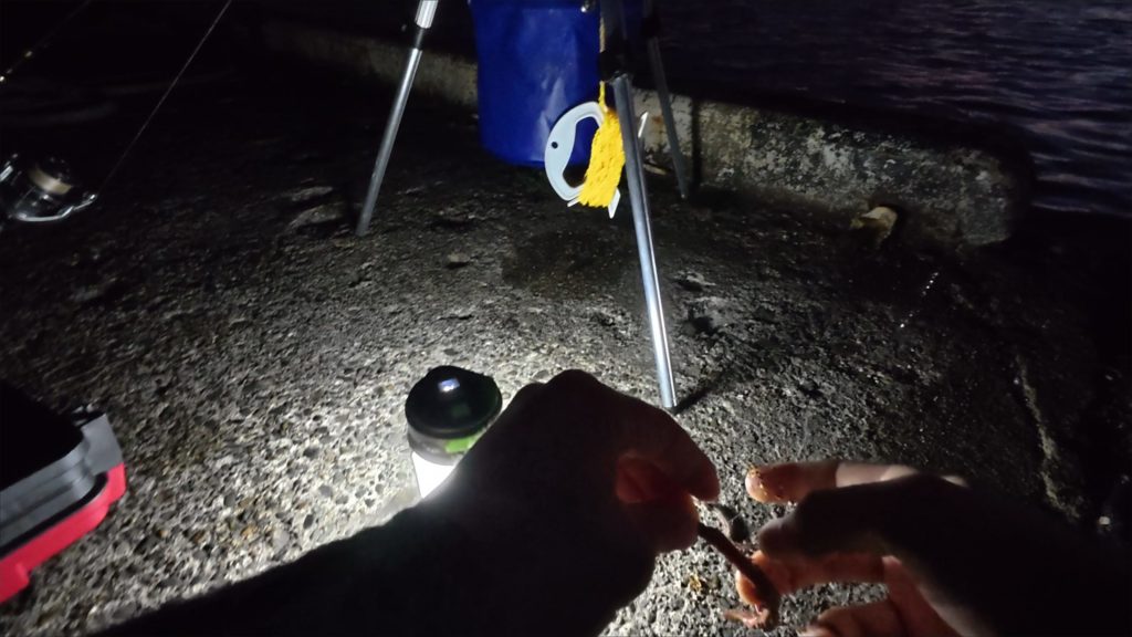 薄暗い中で魂を込めてイソメを仕掛けに付けるぼく。よし!釣れろ!