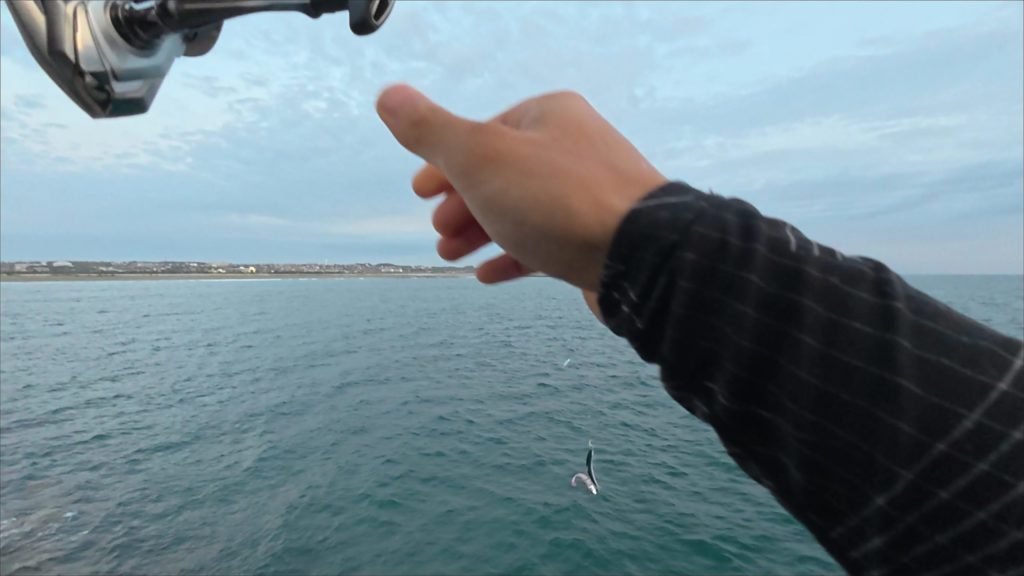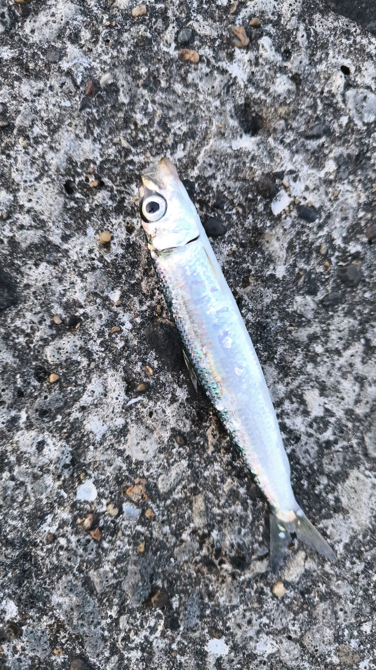 ヒット!釣れたのは ウルメイワシ。やっぱりウルメちゃんは目がかわいいですね。これで「ベイトがいる」ことは確認できました!