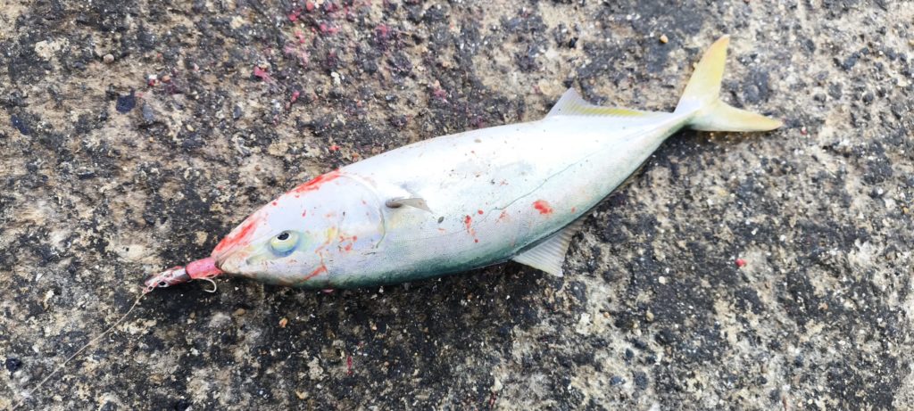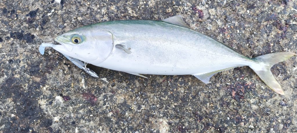 左右が釣れてるってことは、 限界アングラーの足元にもイナダが来てるはず。