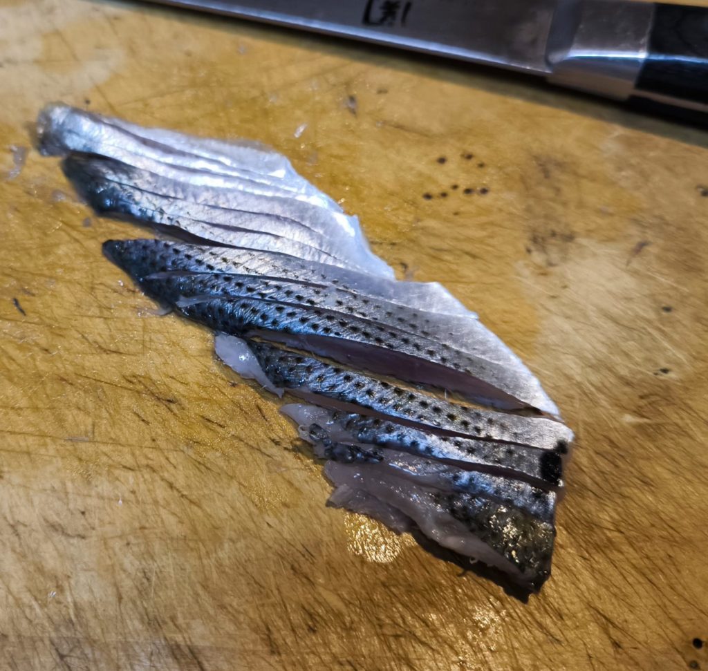 まずは魚を二枚おろしにします。背骨さえ取れていれば、ちょっとぐらい雑でも大丈夫!