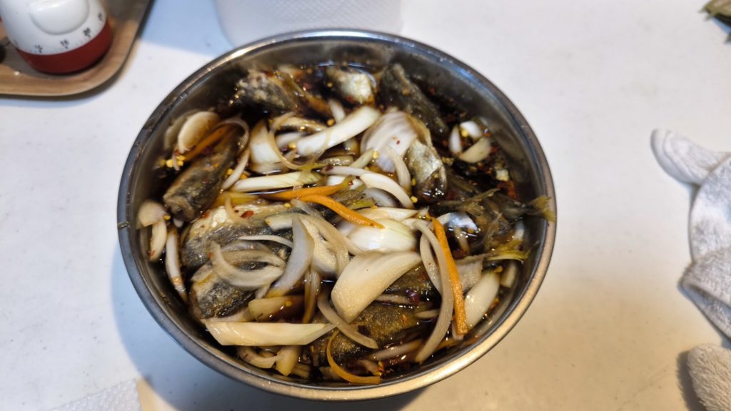 前回の爆釣で30匹以上釣れた小アジを、美味しく・簡単に・手軽に救済すべく、「南蛮漬け」に作りました!