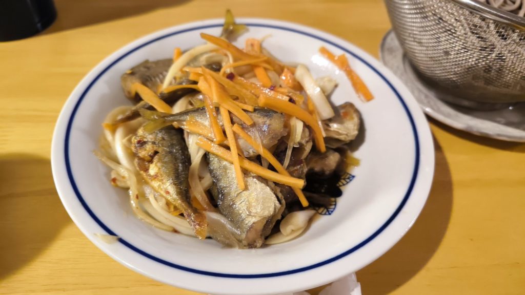 そして完成。本日はお蕎麦と一緒に食べました。小アジがいっぱいで食べごたえがあります。