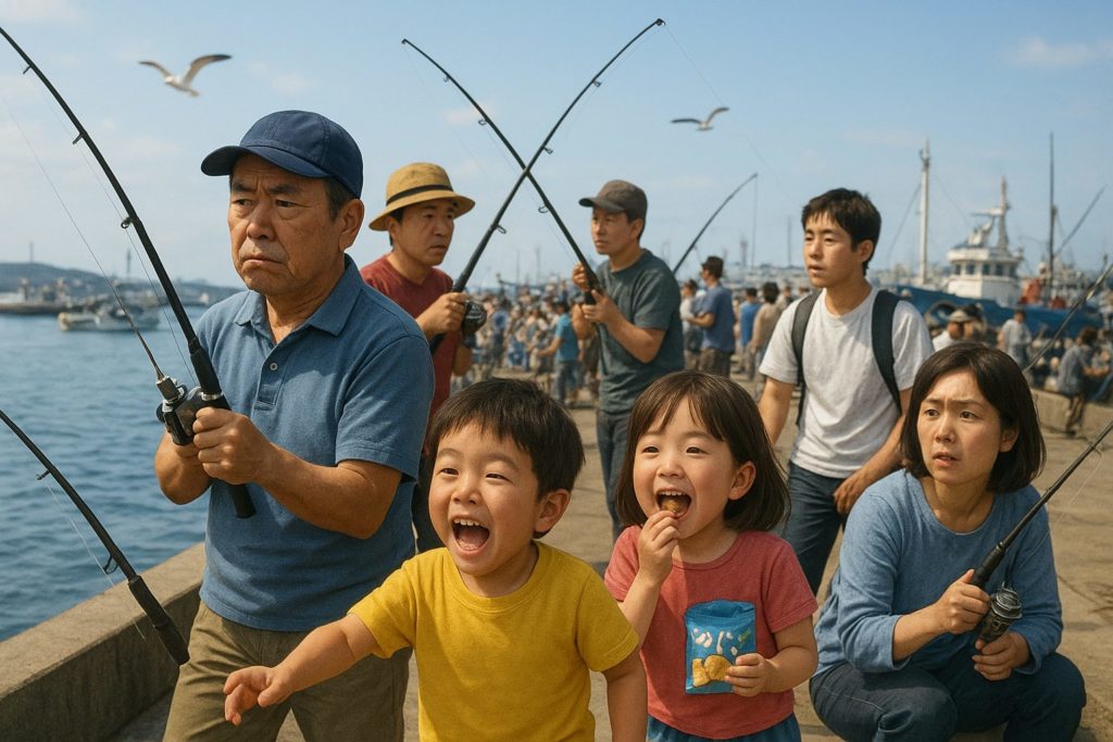 帰省して暇を持て余した親戚一同+子供たちが、こぞって釣り場に集合してるんです。